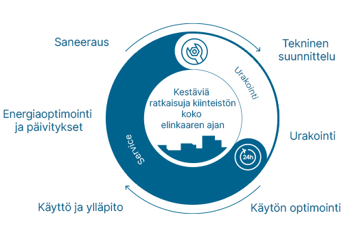 Tarjoamme kestäviä ratkaisuja kiinteistön koko elinkaaren ajalle. Kun vastaamme asiakkaan kiinteistössä useista teknisistä osa-alueista ja toteutamme sekä asennukset että Service-palvelut, luomme asiakkaalle edellytykset koordinointiin, optimointiin, säästämiseen ja tehostamiseen – etenkin energia-asioissa.